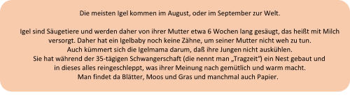 Winter überstehen zu können. Ein erwachsener Igel wiegt knapp das doppelte zur gleichen Zeit.